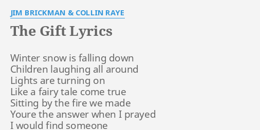 Java version 180_66 JavaTM SE Runtime Environment build 180_66-b17 Java HotSpotTM 64. Jim Brickman Lyrics The Gift with Collin Raye Susan Ashton Winter snow is falling down Children laughing all around Lights are turning on Like a fairy tale come true Sitting by the fire we made Youre the answer when I prayed I would find someone And baby I found you.